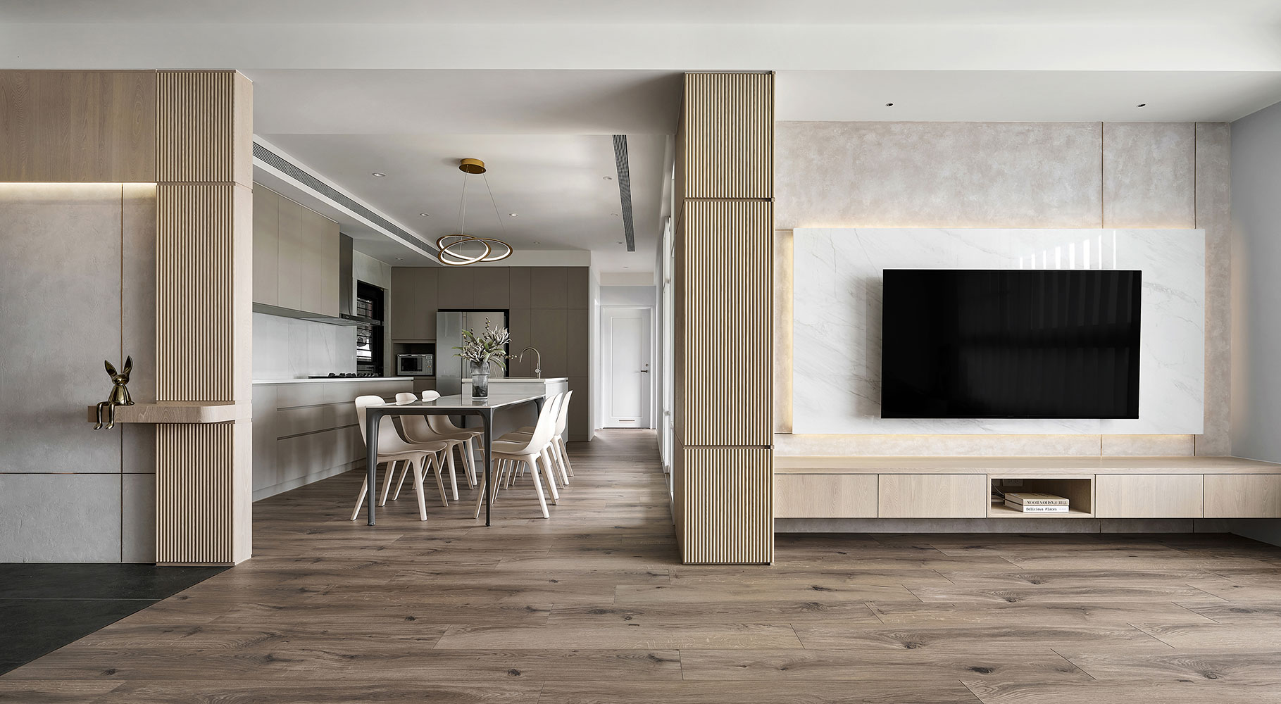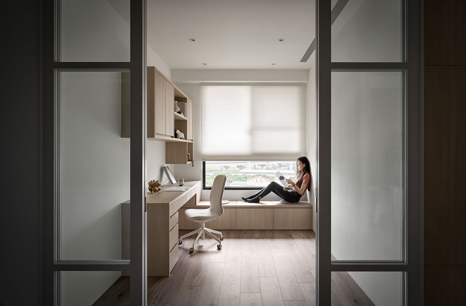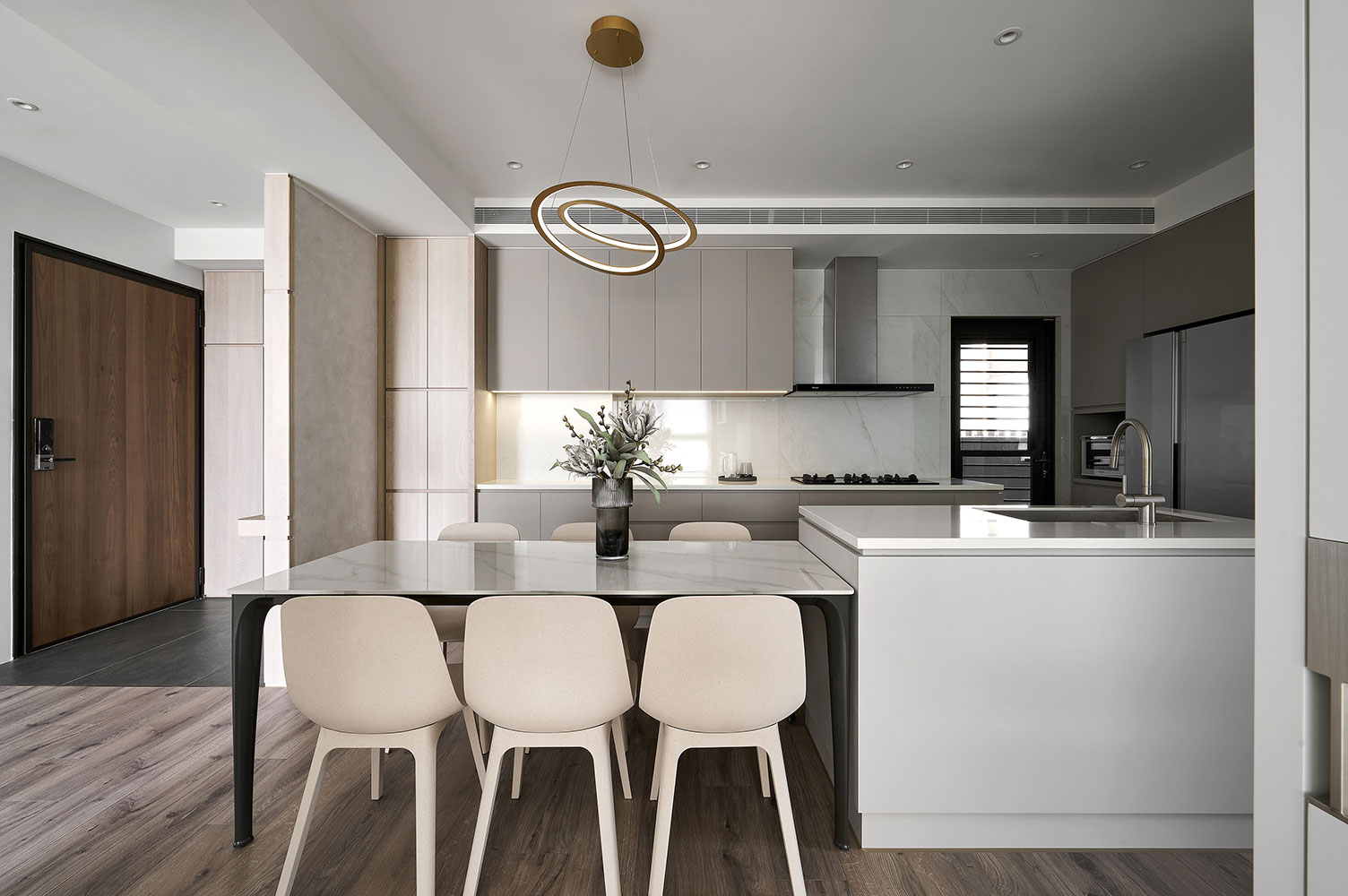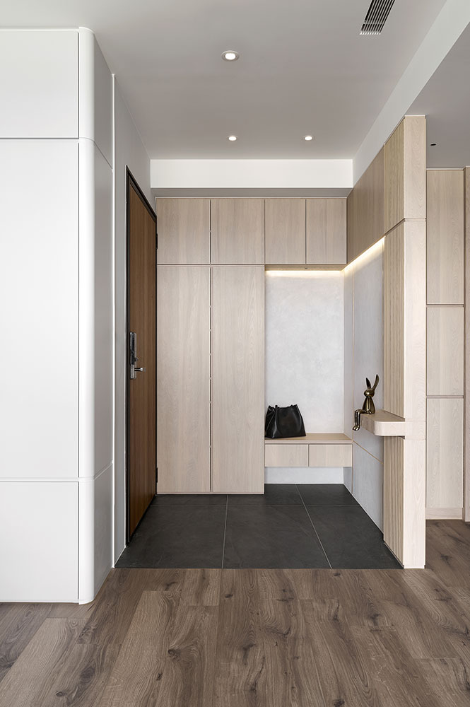 To consider homeowners in their 50s, we built barrier-free flooring and effortless sliding doors to enhance broad and safe living areas. Besides, we plan the kitchen and dining combo space in the center as the kitchen island contributes to making a smooth moving flow. The open layout perfectly accommodates the homeowners with cooking and interacting with families, which fabulously generates day-to-day happiness.